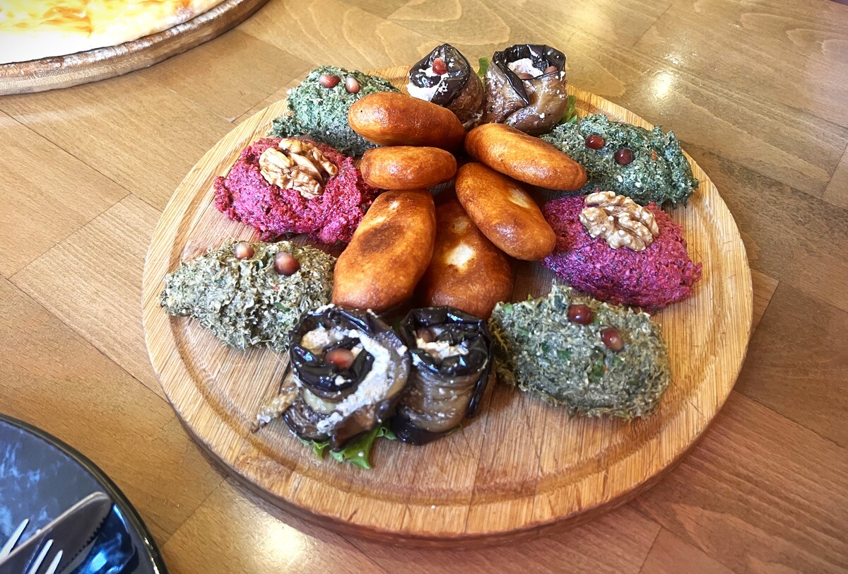 Pkhali, originating from western Georgia, is a selection of vegetables and herbs mixed with a rich walnut dressing. Common varieties include spinach, beetroot and cabbage all seasoned with garlic, vinegar and Georgian spices. The crowned jewel of Pkhali is eggplant with walnuts. Often served as a colorful appetizer, Pkhali beautifully showcases Georgia’s love for walnuts and fresh ingredients.