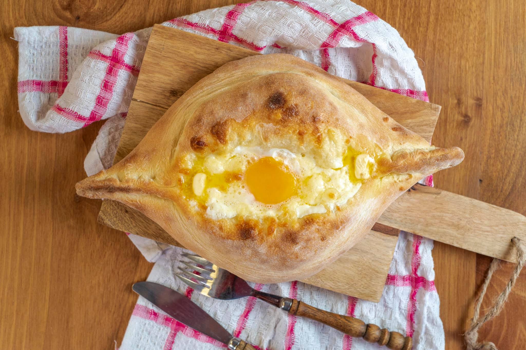 Khachapuri is another iconic traditional Georgian dish that comes in various regional styles. The most popular version is Adjarian Khachapuri, shaped like a boat with an egg yolk in the center. According to legend, this style was created by the wives of sailors, with the egg symbolizing the sun, a wish for their husbands to have good weather and calm seas while sailing.